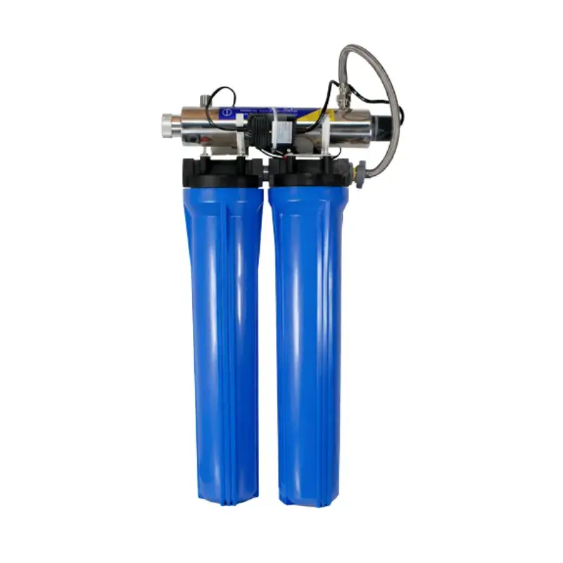 Sistema de purificación de agua de alto nivel que combina dos etapas de filtración con desinfección por luz ultravioleta (UV), diseñado para garantizar agua segura, limpia y libre de microorganismos.